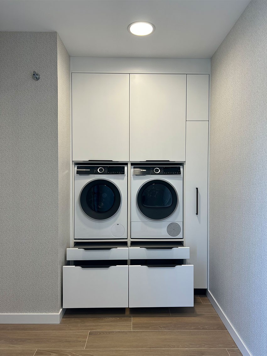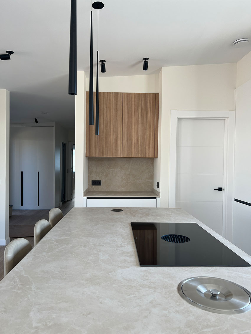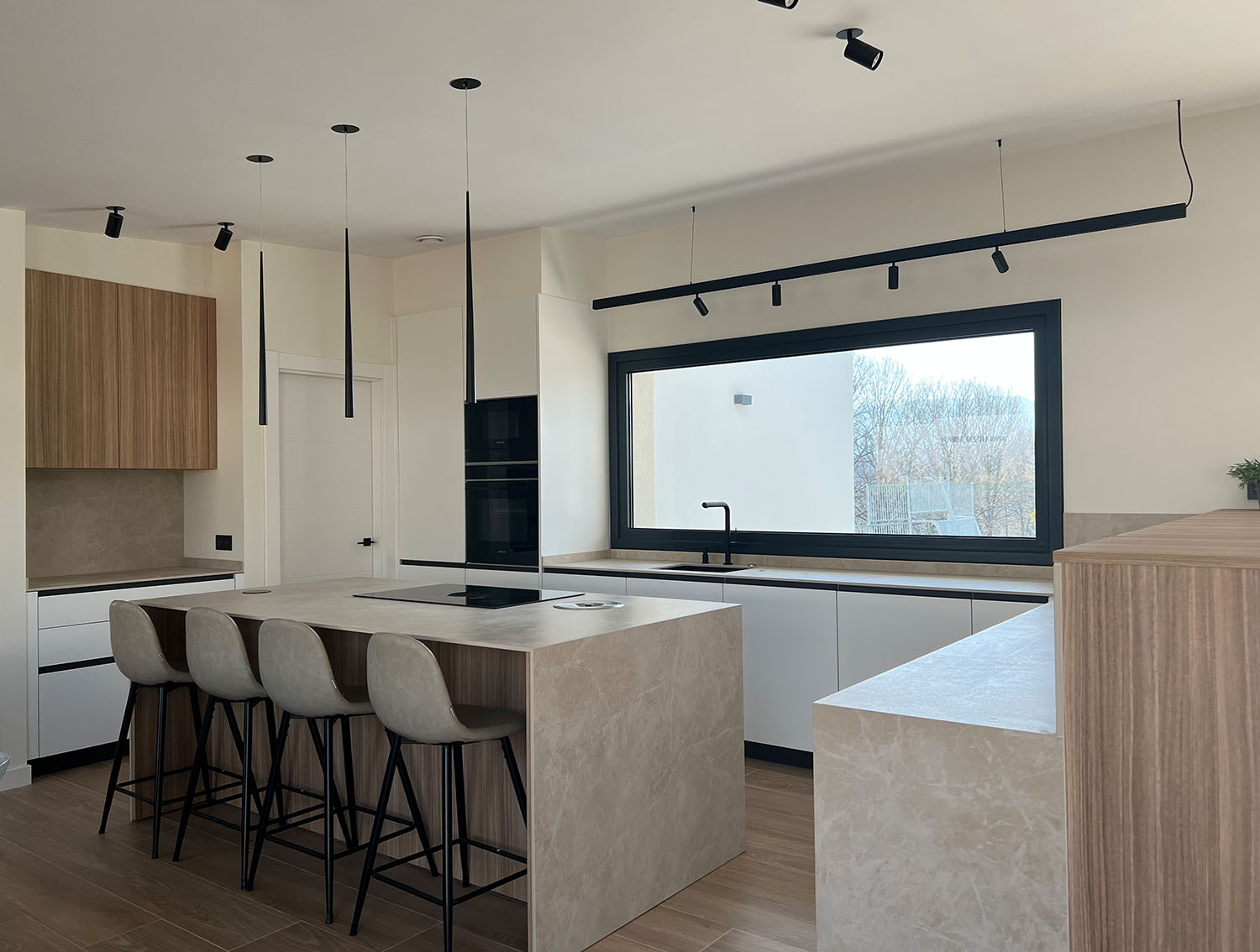 Al norte, el acceso a la vivienda se realiza por un distribuidor que preserva la privacidad de todas las estancias. La zona de día se articula como un amplio espacio diáfano que concentra salón, cocina y comedor. Tiene ventanales al norte y al sur, por donde se abre al porche. Además, la cocina cuenta con despensa anexa para mayor almacenaje y comodidad.