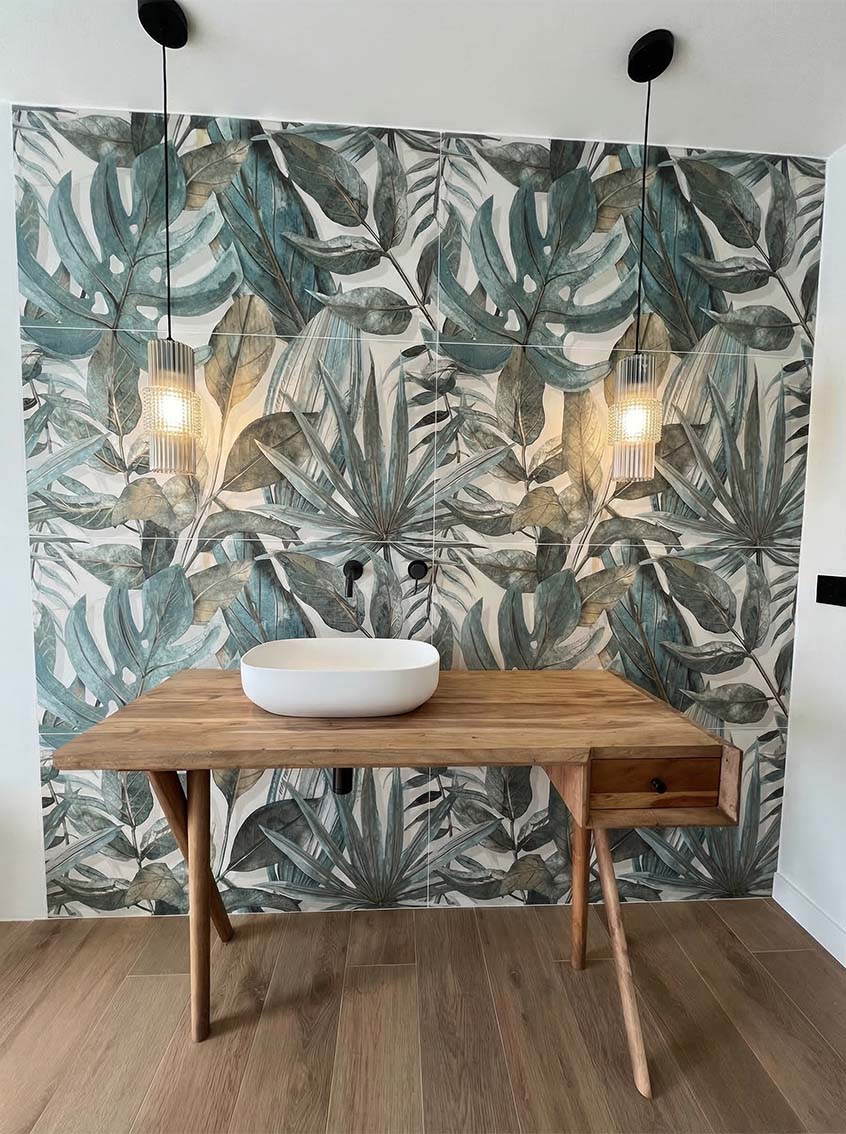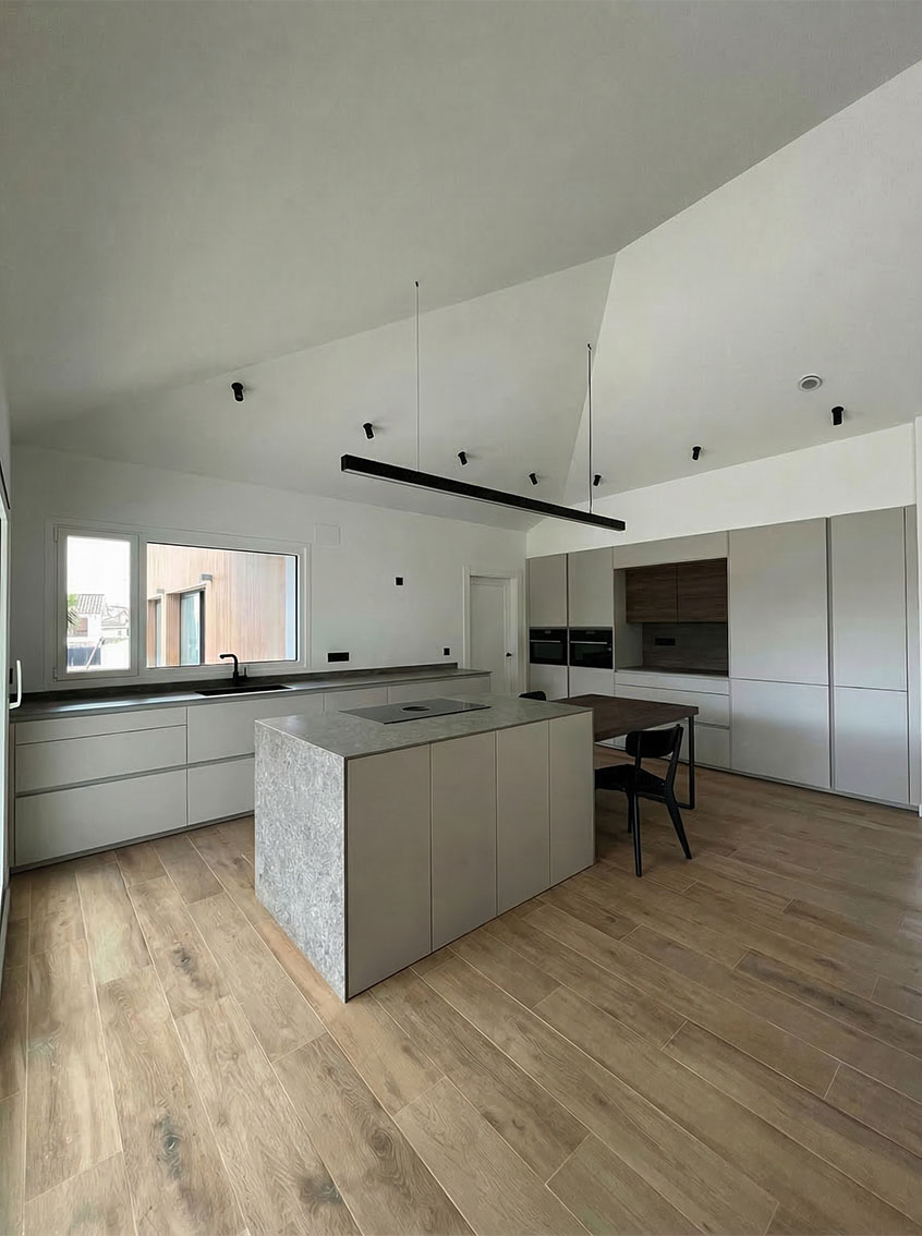 El hall da acceso a la zona social de la casa, el salón comedor, proyectado al exterior con cerramiento de forja y vidrio. Esta zona se complementa con la cocina, anexa al salón pero con total independencia física.